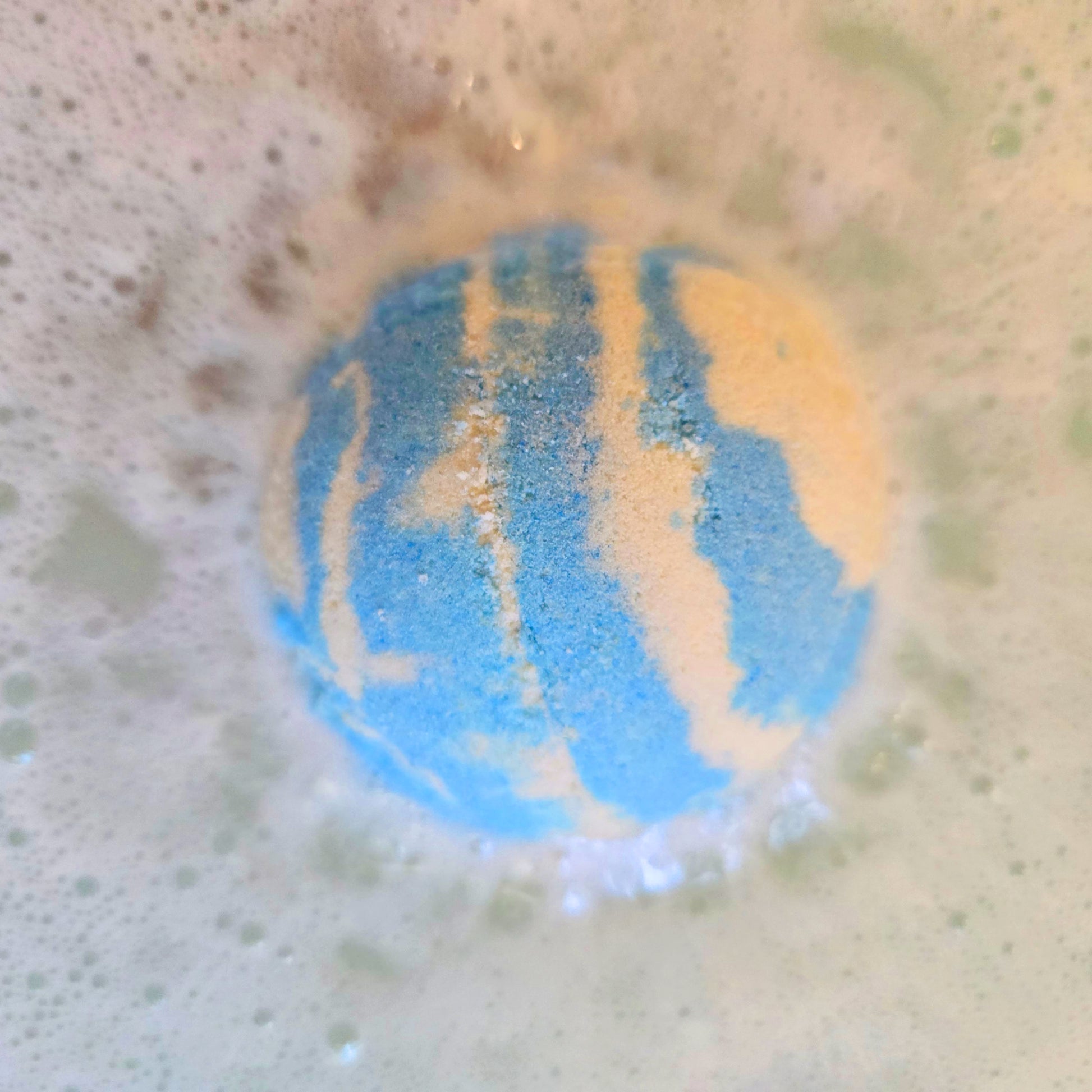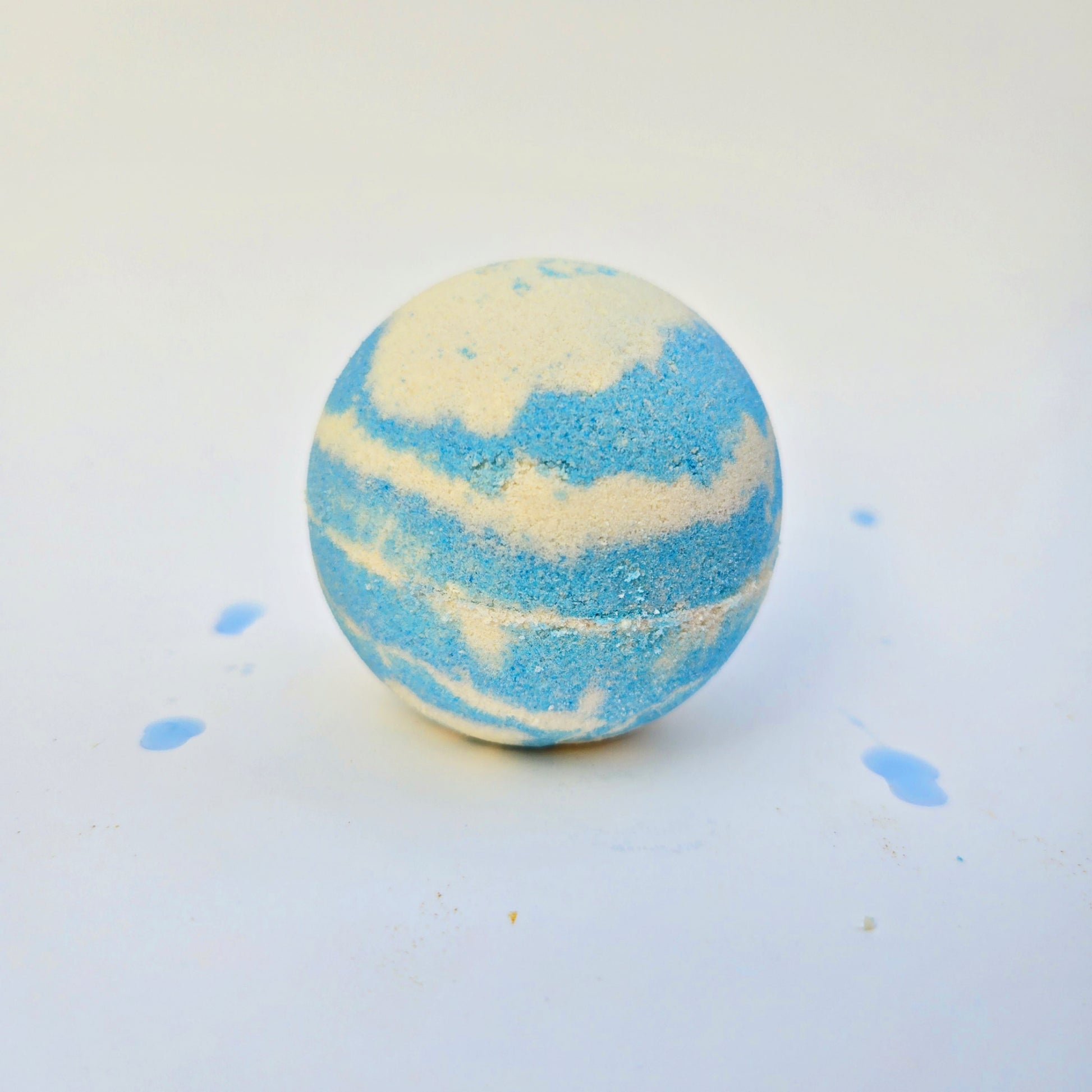 Bleue et blanche comme un ciel de pluie, cette bombe de bain t’offre un moment de calme suspendu, comme si tu te glissais dans l’eau pendant que la pluie tombe doucement dehors.